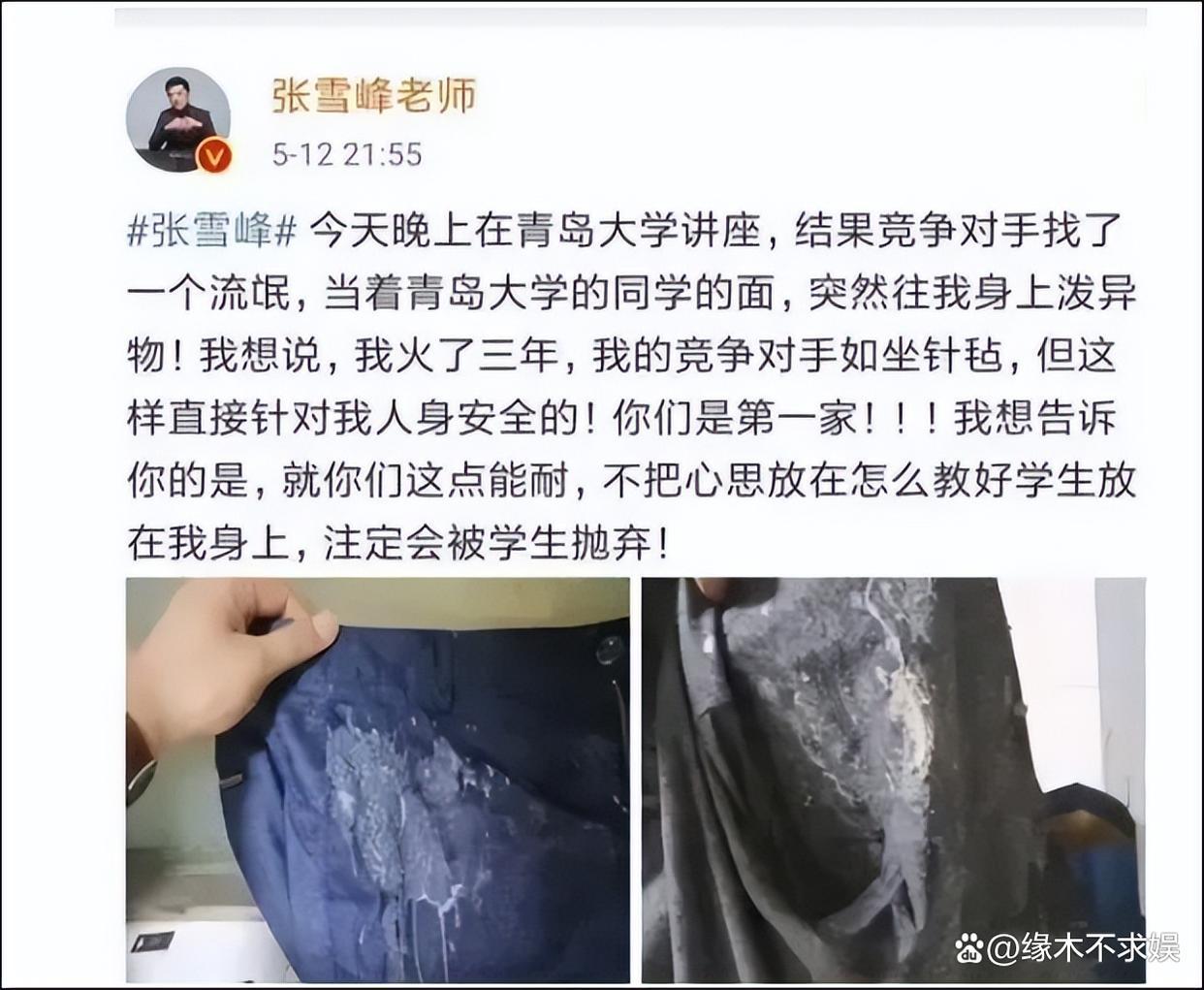 2019年5月,张雪峰在青岛大学讲座时,还有东谈主把鲱鱼罐头泼到了他身上。过后张雪峰还共享了被肮脏的衣物,喊话竞争者:不把心念念放在何如教勤学生身上,注定会被学生毁掉。