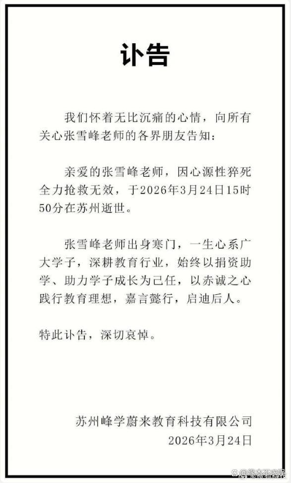 3月24日,张雪峰升天,享年41岁。张雪峰方位的蔚来教训发布讣告,阐述张雪峰是在3月24日下昼3点50分钟在苏州升天。